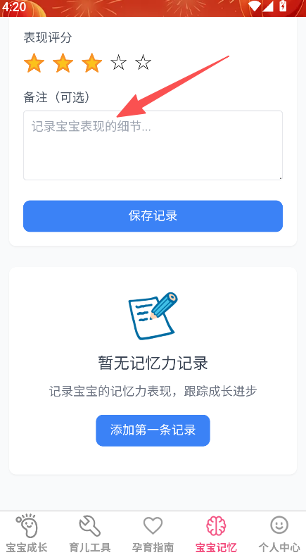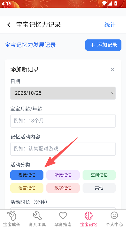 2、在添加新记录页面,填写日期、宝宝月龄、记忆活动内容并选择活动分类。