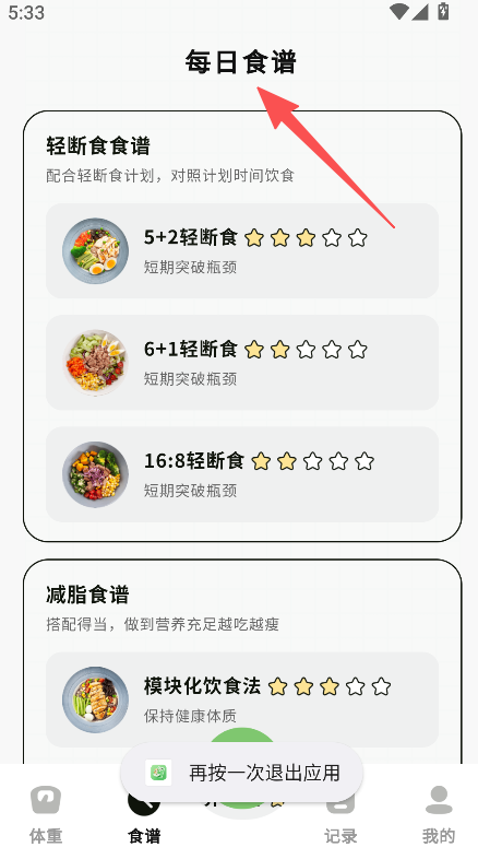 1、打开软件,进入食谱页面,选择轻断食或减脂类食谱计划。