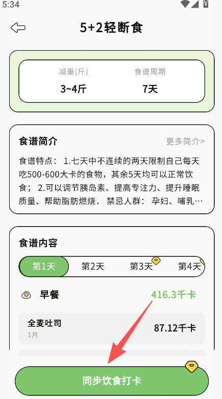 2、设置饮食打卡功能,可同步食谱饮食执行情况,助力养成良好饮食记录习惯,有效监督减肥过程。