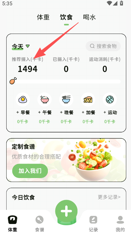 3、进入记录页面,查看推荐摄入、已摄入及运动消耗的卡路里数据。