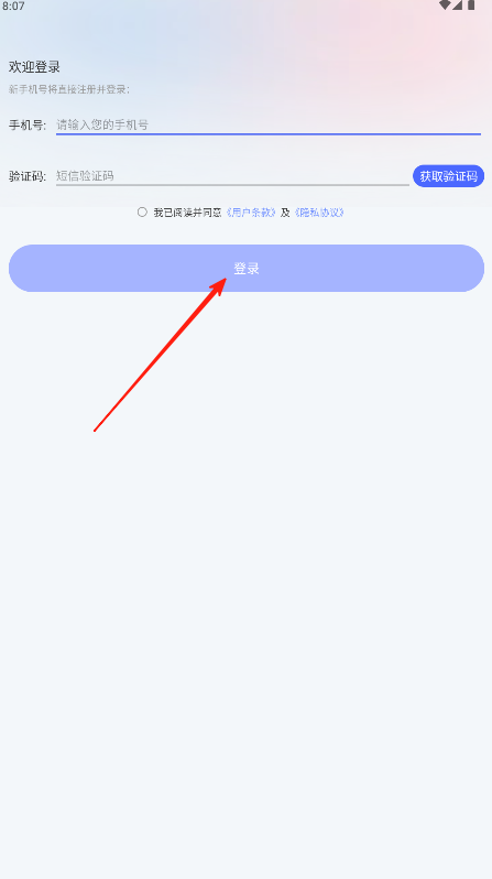1、在登录界面输入手机号与验证码并勾选协议后,点击“登录”按钮。