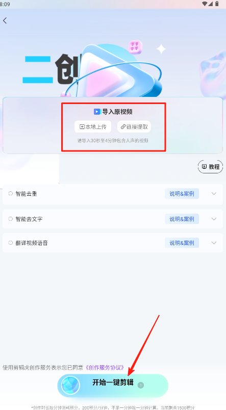 3、在制作页上传视频或通过链接提取素材,确认设置后点击“开始一键剪辑”按钮。