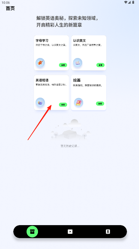 1、在软件首页浏览四大功能模块,点击“英语短语”卡片进入。