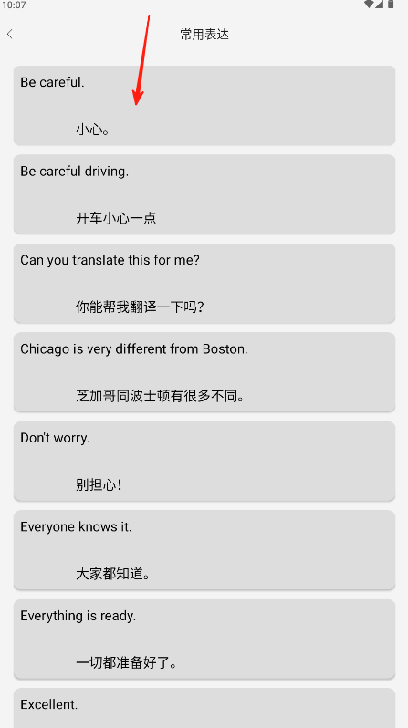 3、进入具体短语列表后,上下滑动即可查看中英对照的常用表达例句进行学习。