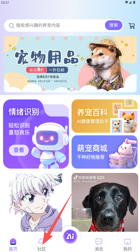 3、集成电商平台与社区交流模块,支持商品购买、订单管理及养宠经验分享互动。