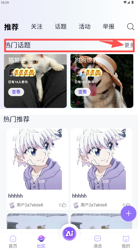 2、在社区页面的“热门话题”区域浏览感兴趣的话题,点击“更多”。