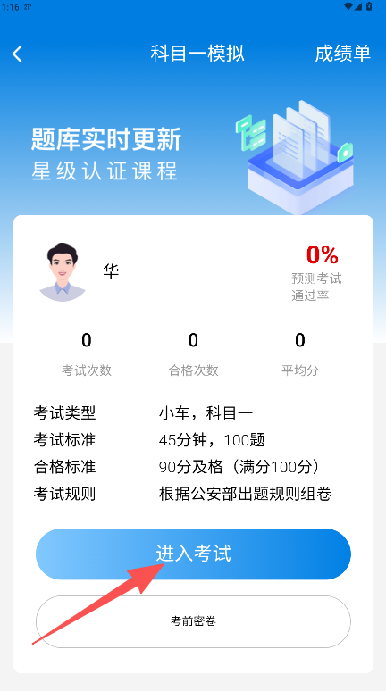 2、进入科目选择页后点击“科目一模拟”选项,查看考试规则后点击“进入考试”。