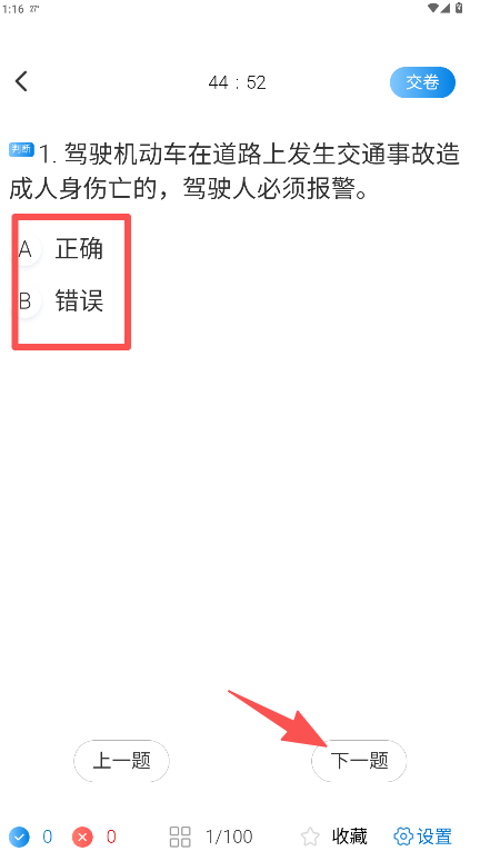 3、在答题界面完成当前题目后,点击底部“下一题”按钮继续作答。