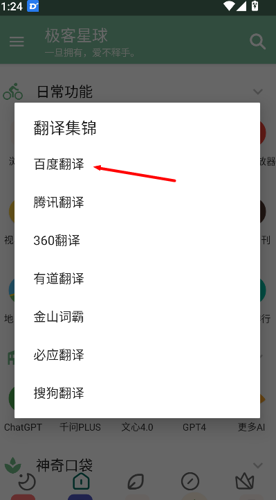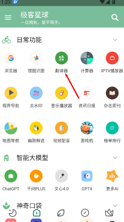 1、进入日常功能界面后,点击“翻译器”选项,可查看多种语言翻译工具入口,方便快速进入翻译功能页面。