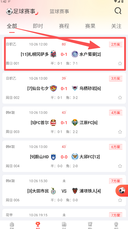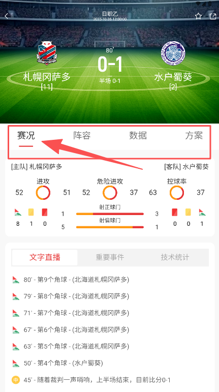 3、在详情页查看实时比分、半场数据及文字直播,多位专家发布的推荐方案列表。