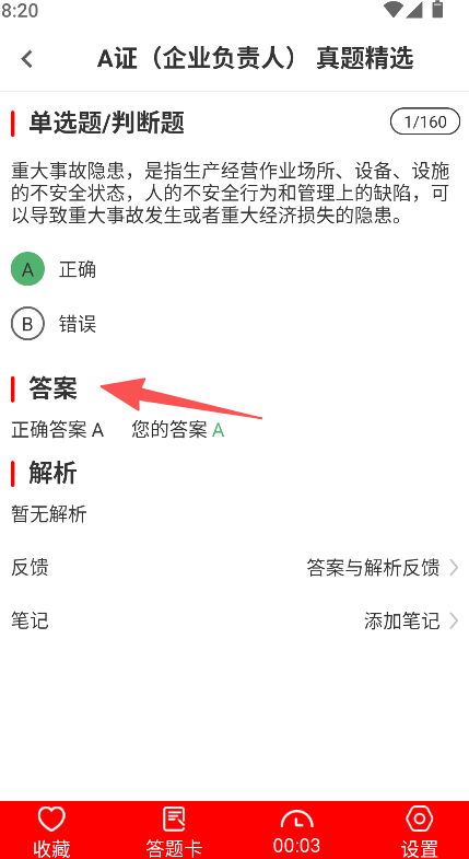 2、支持答案解析功能,做题后查看答案及解析,深入理解题目考点,助力安全员知识巩固。