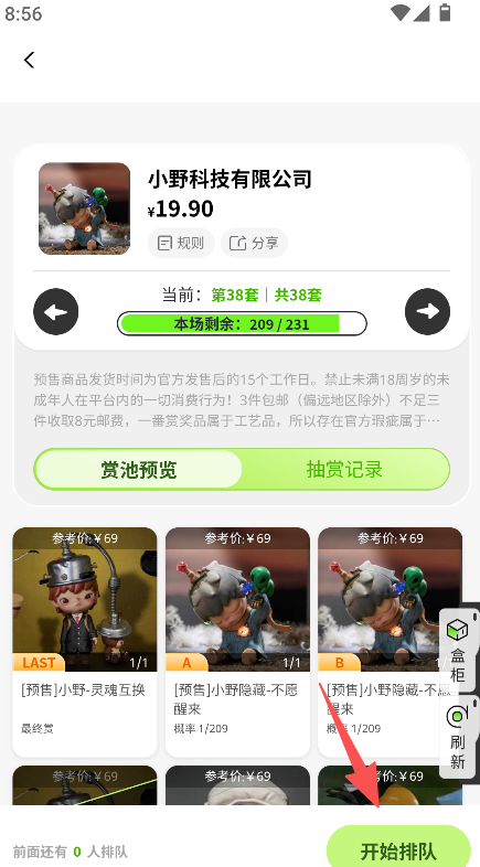 3、玩法流程设计清晰,从一番赏选择项目到赏池预览、开始排队,每一步操作明确,让用户轻松参与潮玩活动,提升潮玩参与的便捷性。