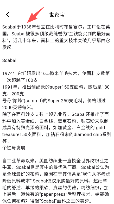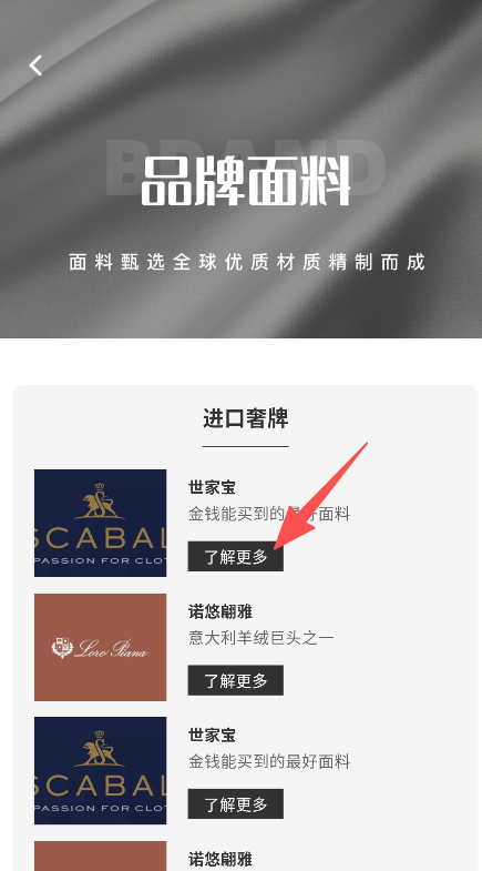 1、具备品牌面料展示功能,详细介绍世家宝等进口奢牌面料的创立历史、技术突破与材质优势,让用户在定制前充分了解面料品质,助力面料选择。