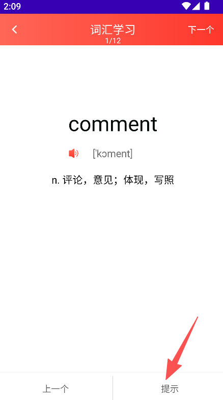3、实现词汇学习功能,每个单词展示发音、释义,还有提示功能,让用户深入学习单词,提升英语词汇掌握程度。