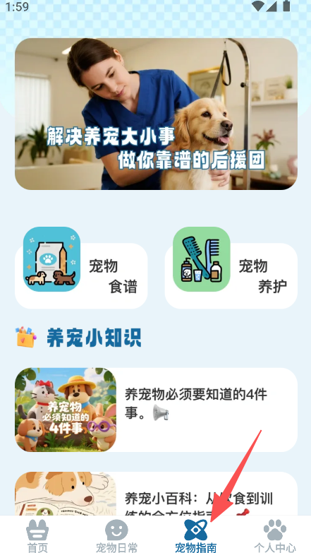 3、实现养宠小知识分享功能,推送养宠必须知道的事项、从饮食到训练的小百科等内容,让养宠人掌握实用养宠常识。