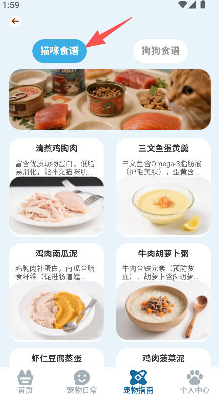 1、具备宠物食谱功能,提供猫咪、狗狗专属食谱,详细展示食材、制作步骤、营养价值及适用时期,满足宠物饮食健康需求。