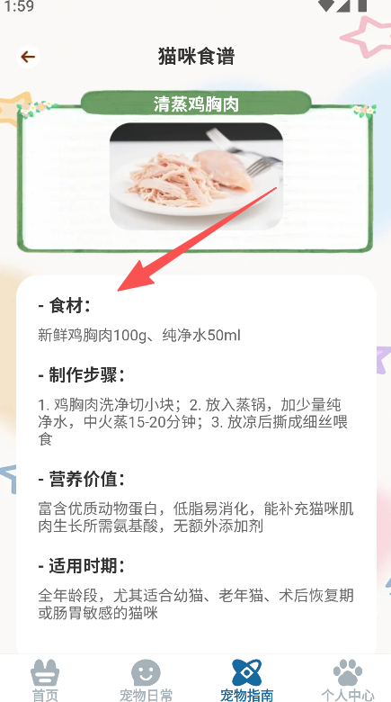 1、宠物食谱专业详尽,每种食谱明确食材、制作步骤、营养价值及适用时期,如清蒸鸡胸肉适合各年龄段猫咪,让宠物饮食健康且营养均衡。