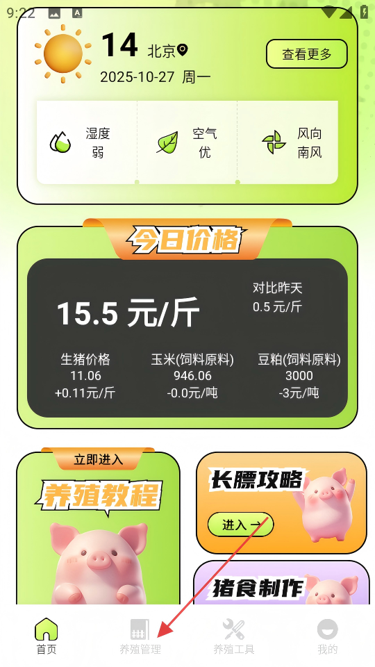 1、在软件首页点击底部【养殖管理】按钮,进入养殖管理页面。