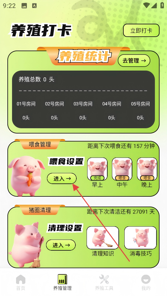 2、在养殖管理页面点击【喂食设置-进入】按钮,进入设置喂食时间页面。