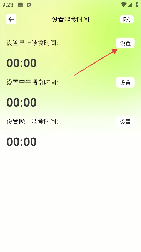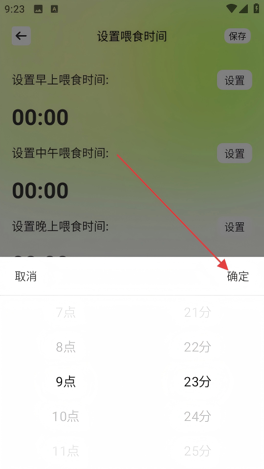 4、设置完成后点击【保存】,即可完成早上喂食时间的设置流程。
