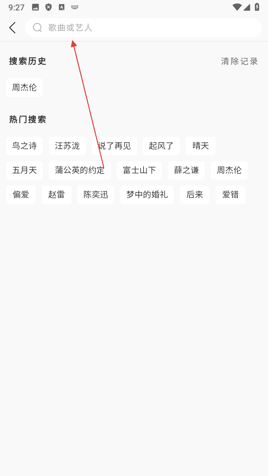 2、在搜索页面点击【搜索框】,输入目标歌曲或艺人名称。