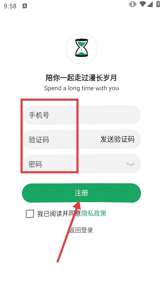 4、在注册页面输入【手机号】【验证码】【密码】,勾选同意隐私政策后点击【注册】,完成账号注册操作。