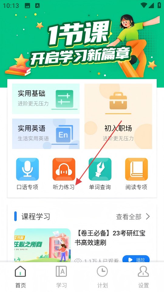 1、在软件首页点击【听力练习】,进入听力专项页面。