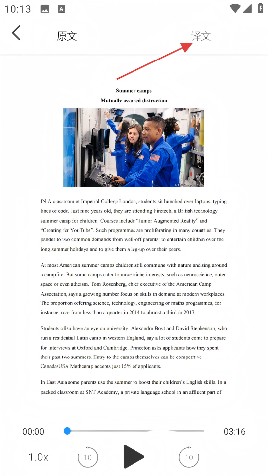 2、在听力专项页面选择【Summer-camps】文章,进入该文章的原文页面。