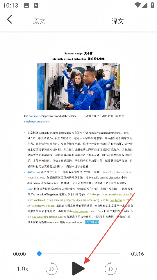 4、点击播放按钮,即可收听该文章的听力内容,完成英语听力学习流程。