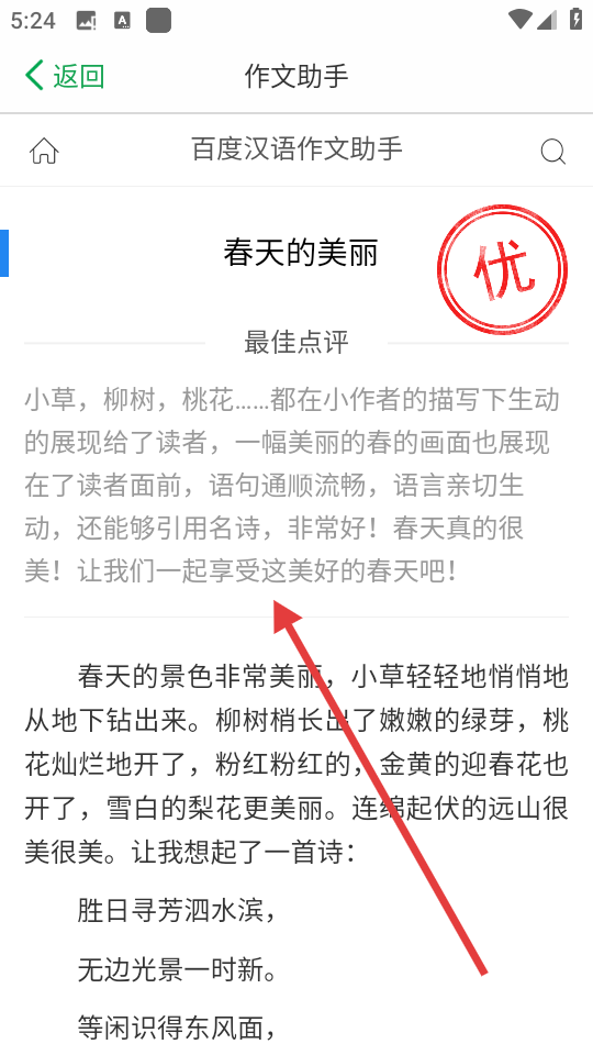 4、查看《春天的美丽》作文的最佳点评和全文内容,学习其写作思路与语言表达。