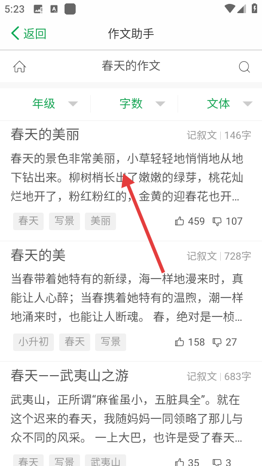 3、在“春天的作文”列表中,点击《春天的美丽》作文条目。