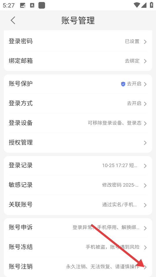 3、在账号管理页面,点击【账号注销】选项进入注销流程。