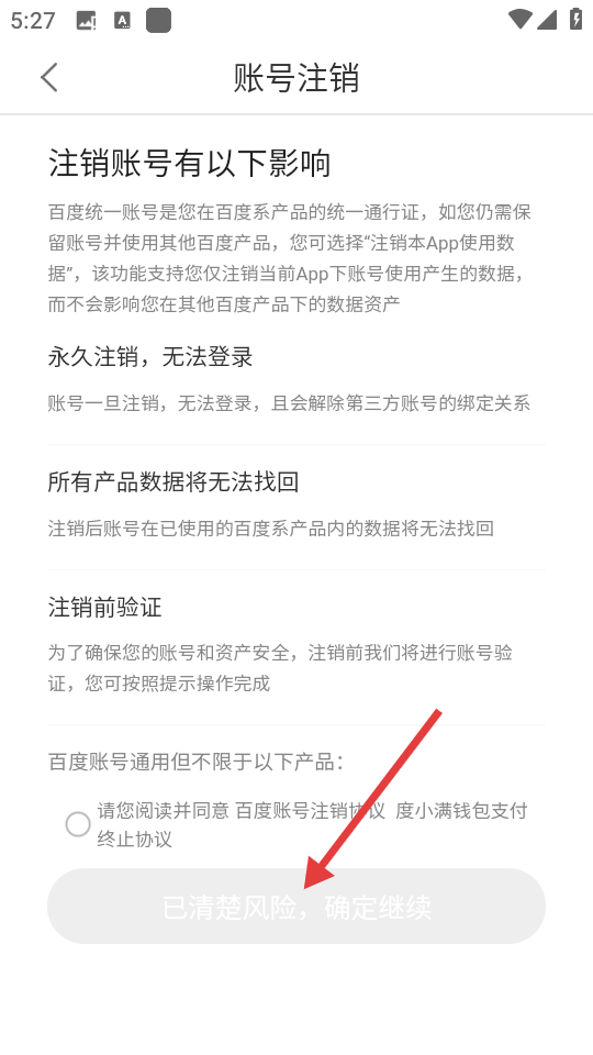 4、在账号注销页面,阅读注销影响说明后,点击【已清楚风险,确定继续】按钮完成注销操作。