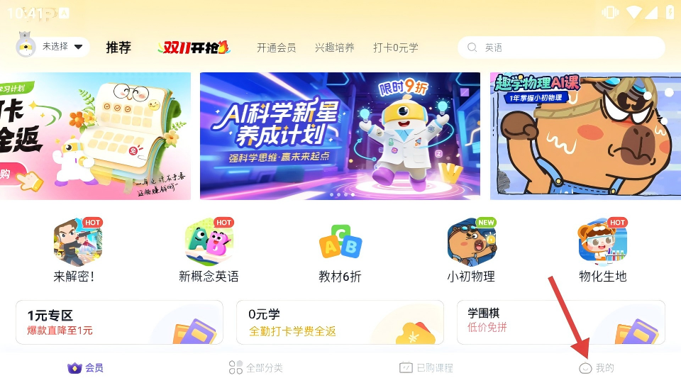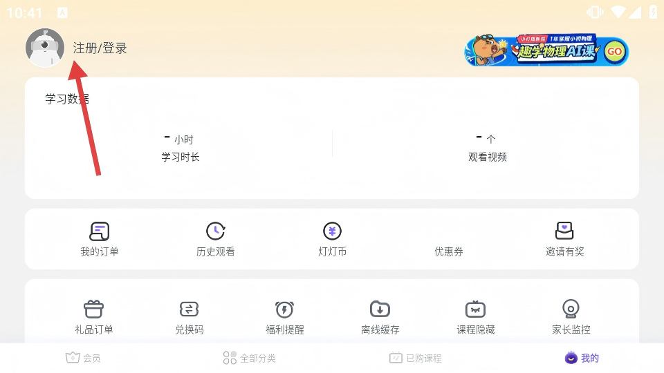 1、点击底部【我的】,进入个人页面,可查看学习数据、我的订单等功能入口。