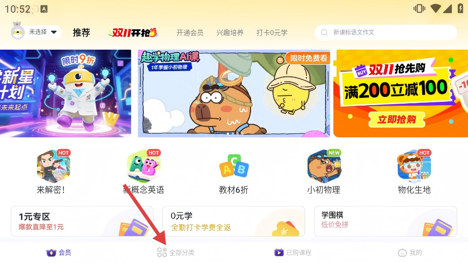 1、点击底部【全部分类】,进入课程分类页面,可查看思维训练、英语启蒙等各类课程分类。