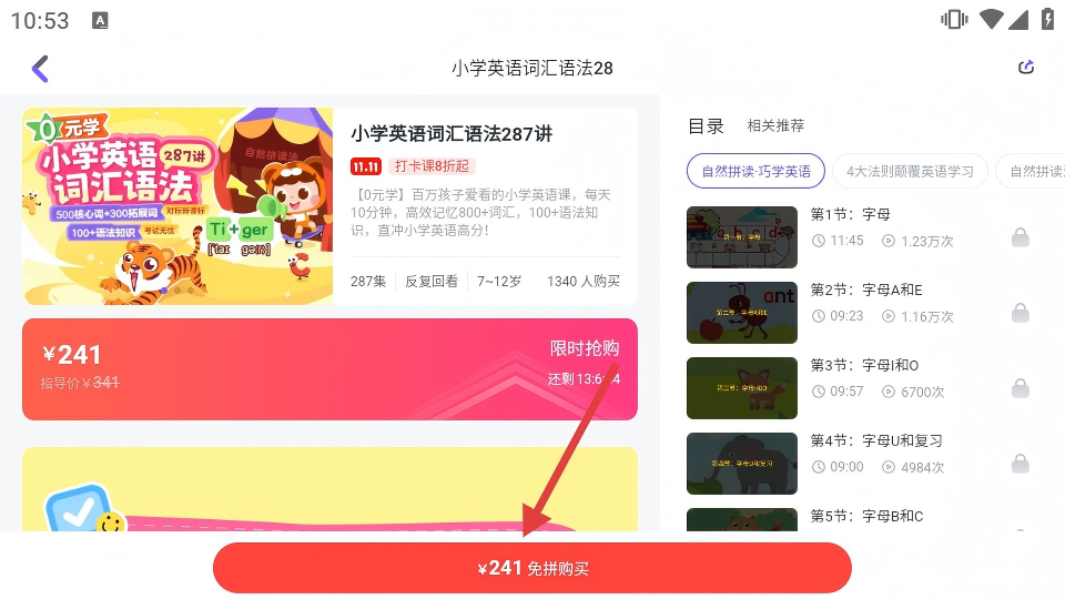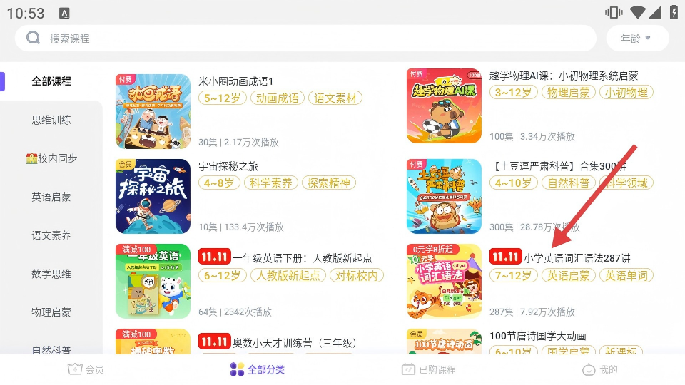 2、在课程分类页选择目标课程(如小学英语词汇语法287讲),进入课程详情页。