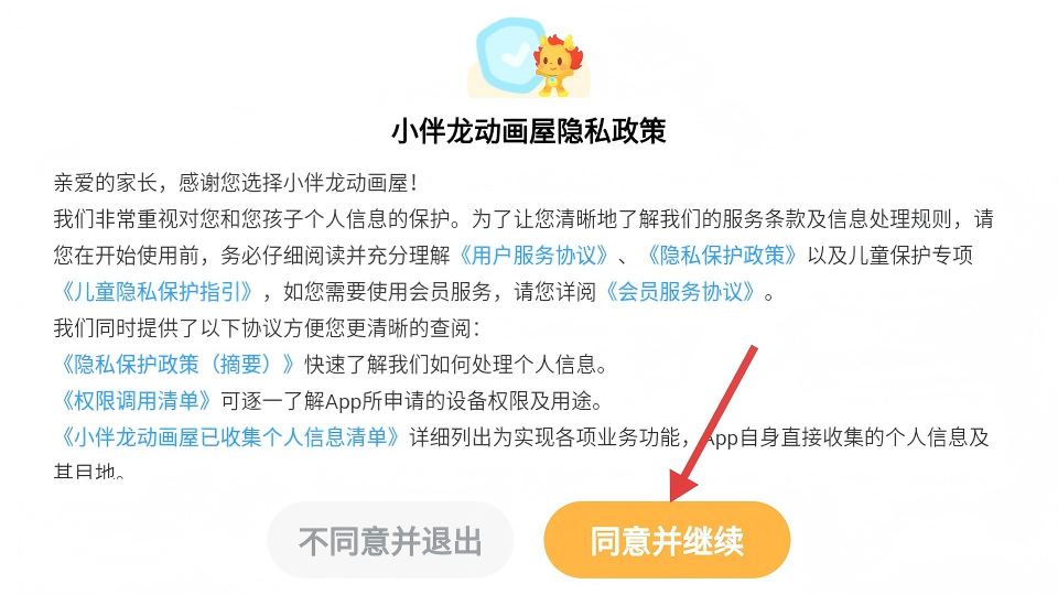 1、在隐私政策弹窗中点击【同意并继续】,进入小伴龙动画屋主界面。