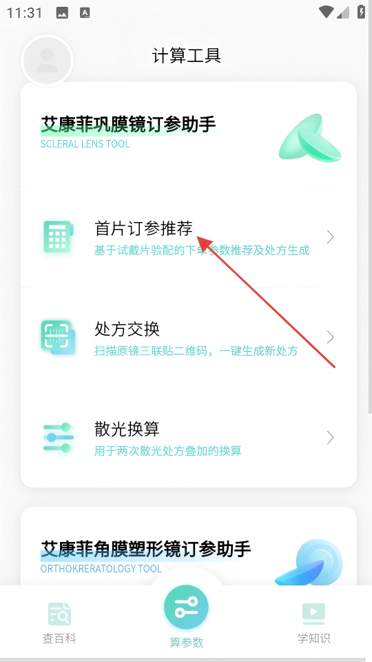 1、在计算工具页面点击【首片订参推荐】,进入选择眼别页面。