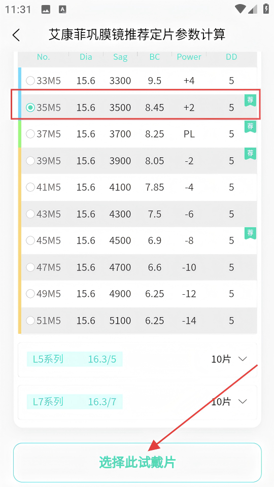 3、进入艾康菲巩膜镜推荐定片参数计算页面,选择试戴片,点击【选择此试戴片】。