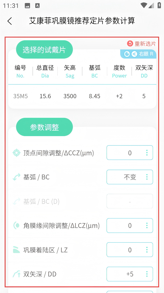 1、支持艾康菲巩膜镜推荐定片参数计算,可自行选择对应的试戴片类型操作,为后续选参提供可靠数据支撑。