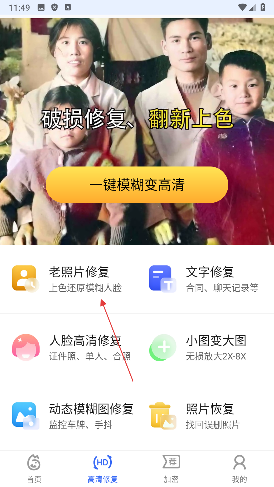 2、在高清修复功能页面,点击【老照片修复】,进入照片选择页面。
