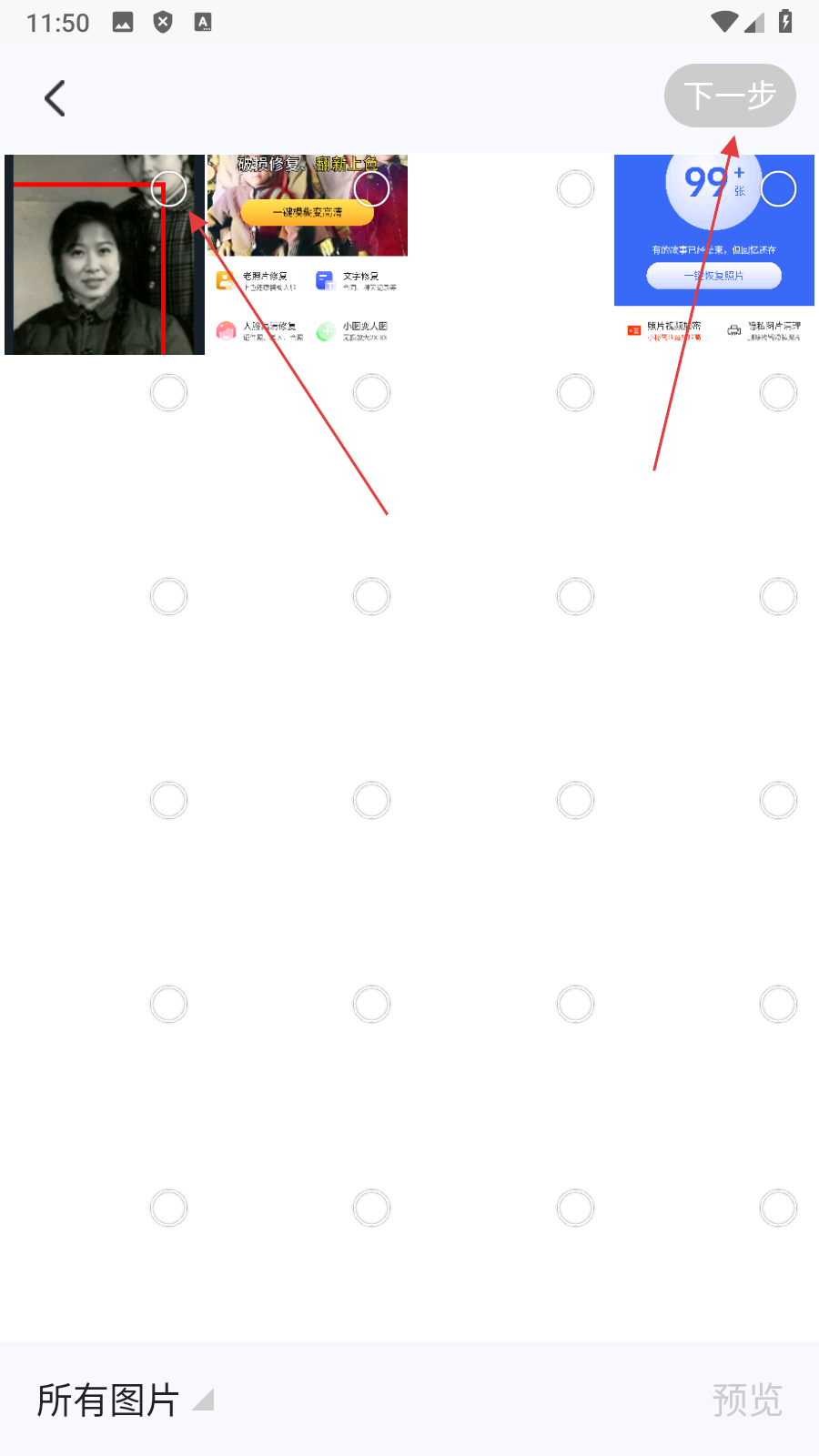 3、在照片选择页面【选择目标照片】后点击【下一步】,进入修复准备页面。