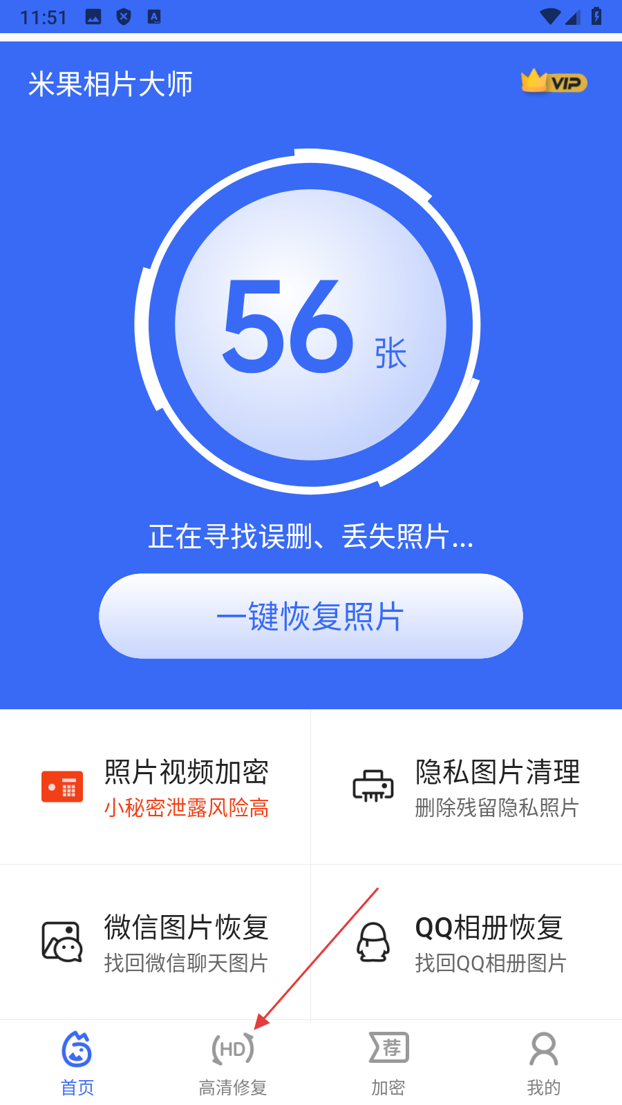 1、点击底部【高清修复】,进入高清修复功能页面。