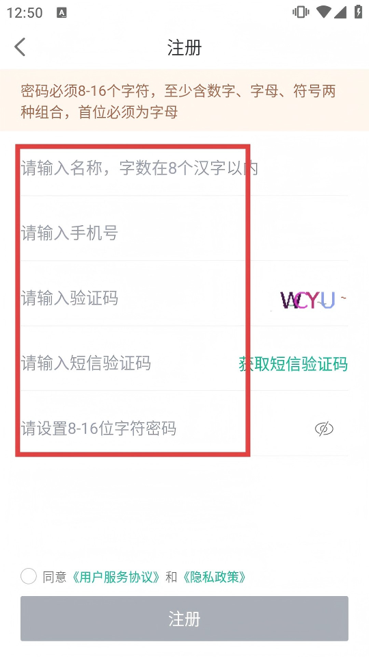 3、在注册页面填写【名称】【手机号】【验证码】【短信验证码】,设置8-16位符合要求的密码。