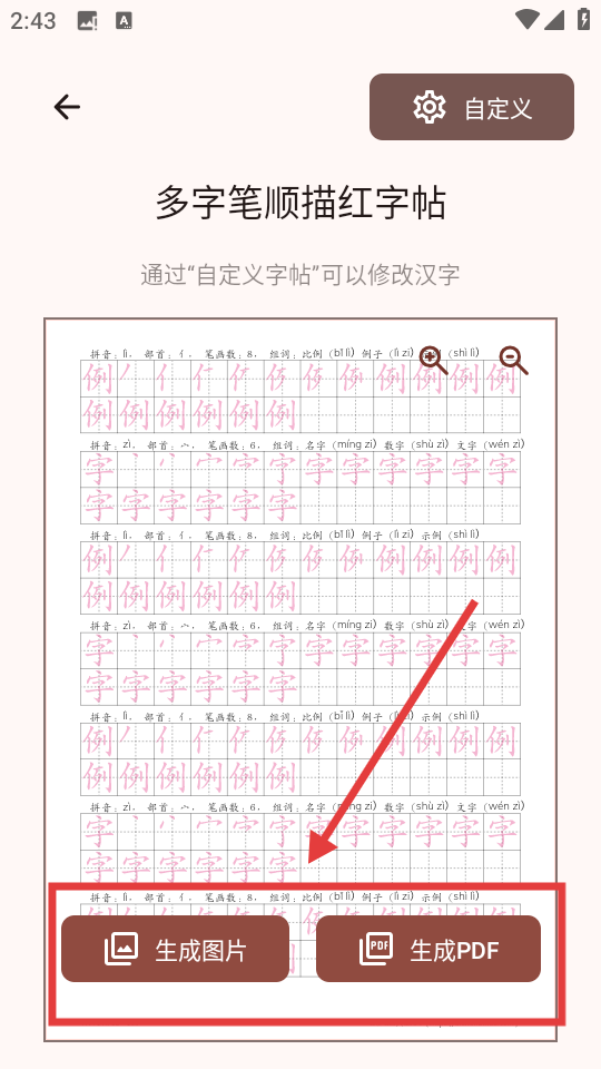 4、在字帖详情页,可点击【生成图片】或【生成PDF】按钮,获取对应的字帖文件。