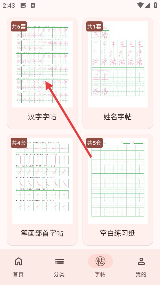 2、在字帖选择界面,点击【汉字字帖】选项,进入汉字字帖分类页面。