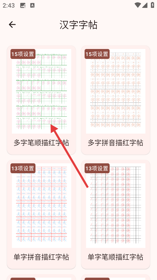 3、在汉字字帖分类页面,点击【多字笔顺描红字帖】选项,进入字帖详情页。