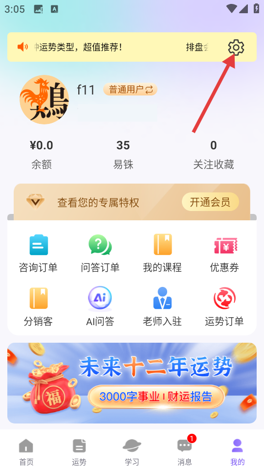 1、在“我的”页面,点击右上角设置图标,进入设置界面。
