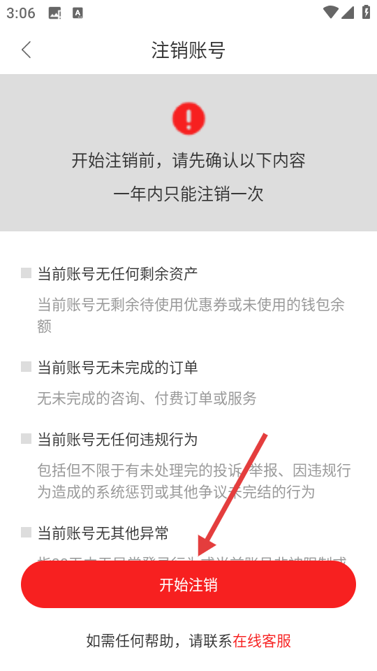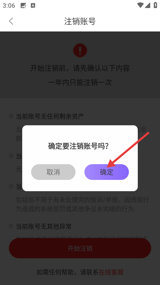 3、在注销账号页面,点击【开始注销】按钮,触发确认弹窗。