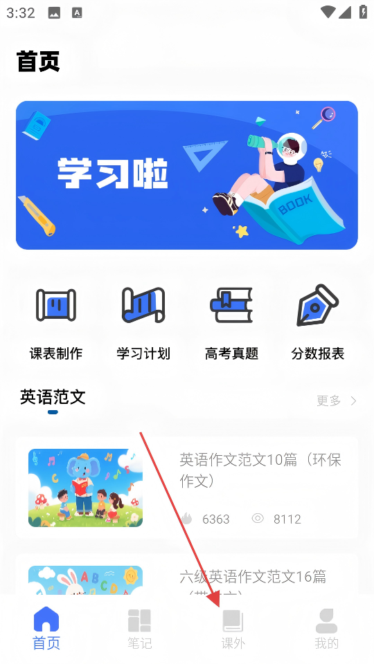 1、在APP首页点击底部【课外】按钮,进入课外学习页面。